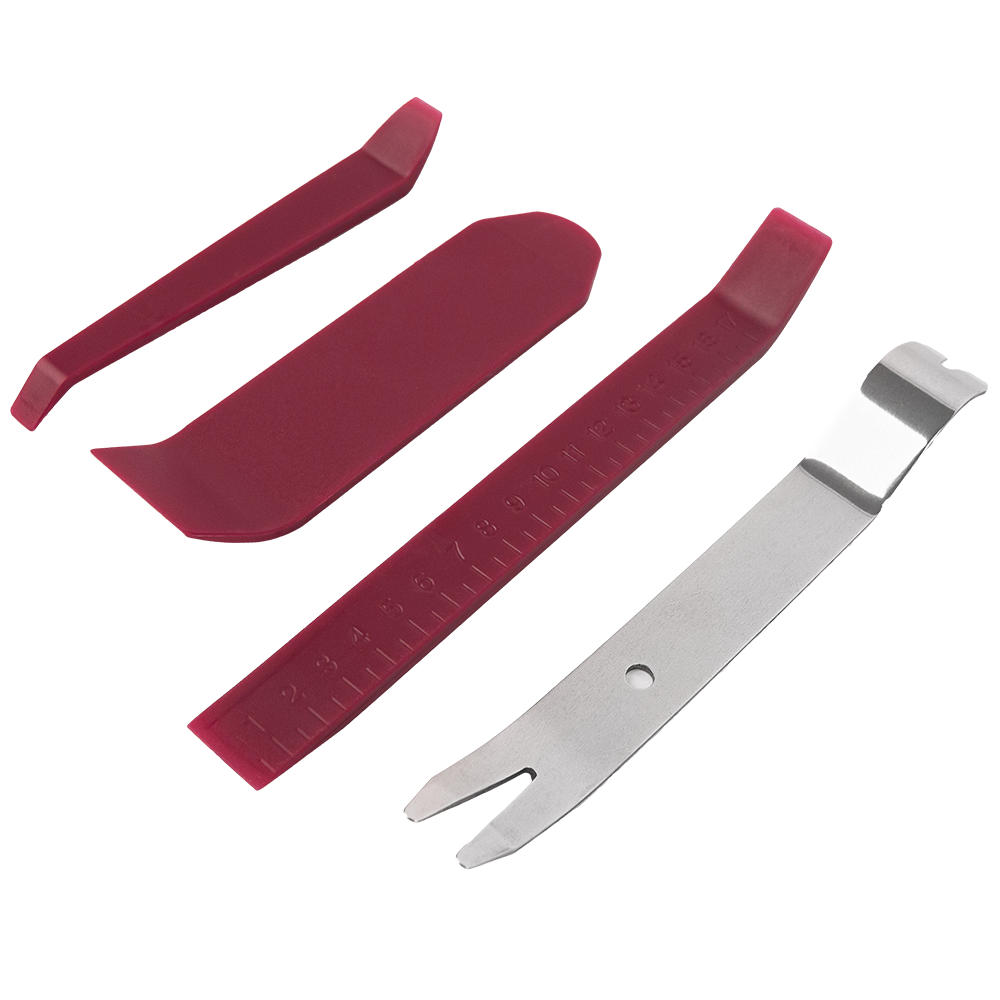 Набор ключей из 4 предметов, которые позволят аккуратно выполнить установку переходной рамки, головного устройства без повреждений салона автомобиля. С их помощью можно демонтировать автомобильную обивку, штатный ресивер и другие элементы для установки новой аудиосистемы. Инструменты изготовлены из металла и пластика, характеризуются высокими показателями прочности и эффективностью применения.