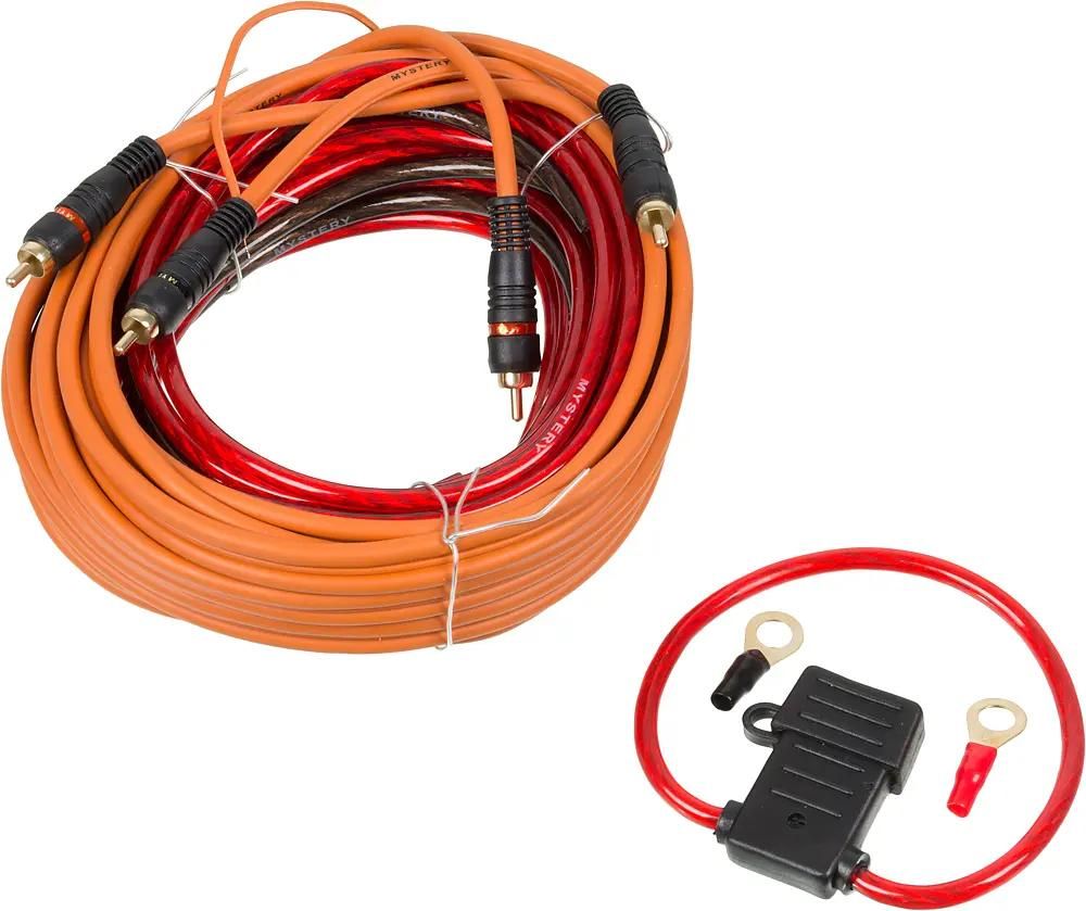 Установочный комплект Mystery MAK-2.10 предназначен для подключения двухканального усилителя к аккумуляторной батарее автомобиля. В его состав входят красный силовой кабель с сечением 6 мм² длиной 5 м, черный силовой кабель с такого же диаметра длиной 1 м, АТС-предохранитель на 30 А с корпусом, пятиметровый кабель RCA с управляющим проводом и две круглые клеммы.
