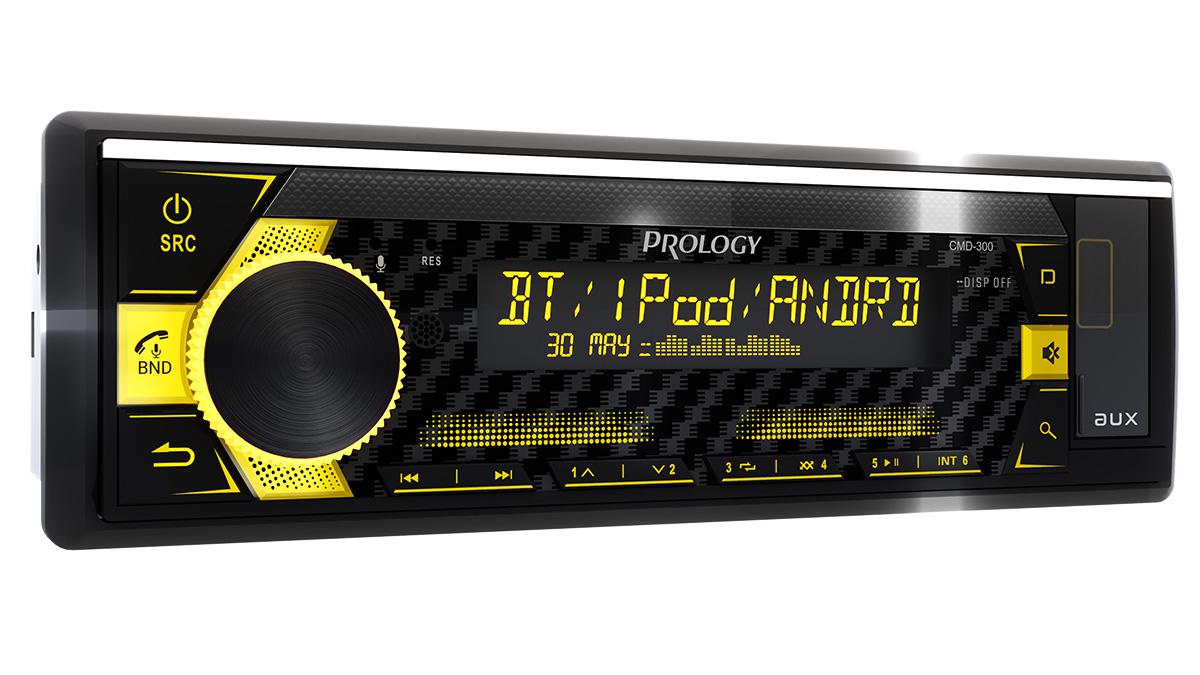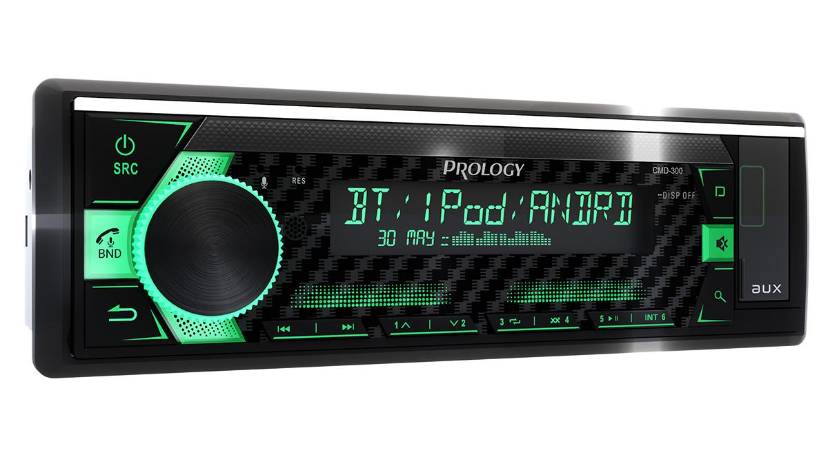 PROLOGY CMD-300 — FM / USB ресивер с Bluetooth и встроенным DSP - аудиопроцессором, стандартного размера 1DIN, который обеспечивает прием радиостанций в диапазоне FM / УКВ / AM и воспроизведение медиафайлов MP3, WAV, и FLAC форматов, записанных на USB накопители, передачу звука с внешних источников через линейный аудиовход и беспроводной интерфейс Bluetooth. Поддерживается управление мобильным телефоном через интерфейс Bluetooth (ver. 4,2).