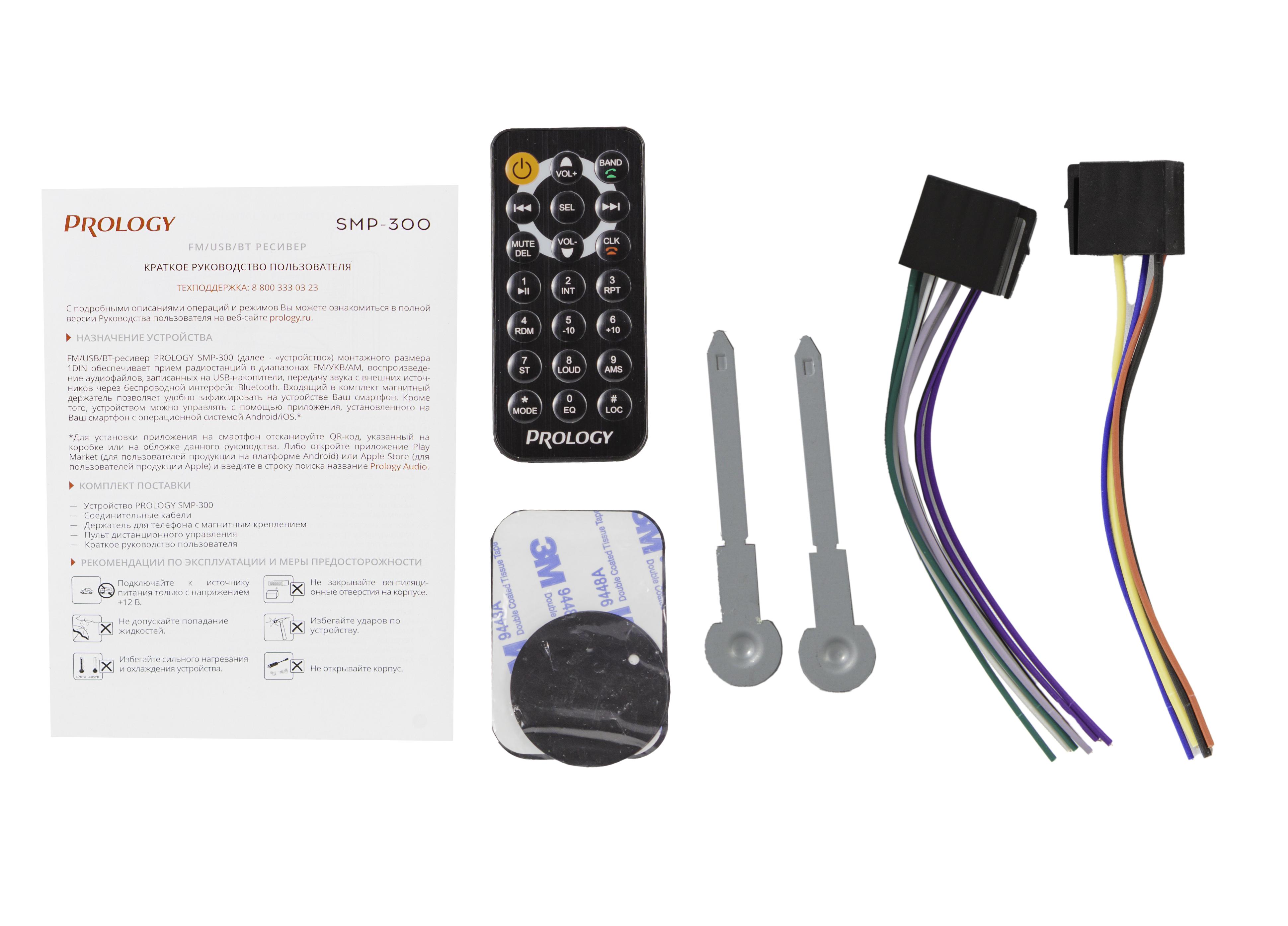 PROLOGY SMP-300 FM / USB ресивер с Bluetooth, монтажного размера 1DIN, который обеспечивает прием радиостанций в диапазонах FM/УКВ/AM, воспроизведение аудиофайлов MP3, WAV, и FLAC форматов,, записанных на USB-накопители, передачу звука с внешних источников через беспроводной интерфейс Bluetooth (ver. 4,2).